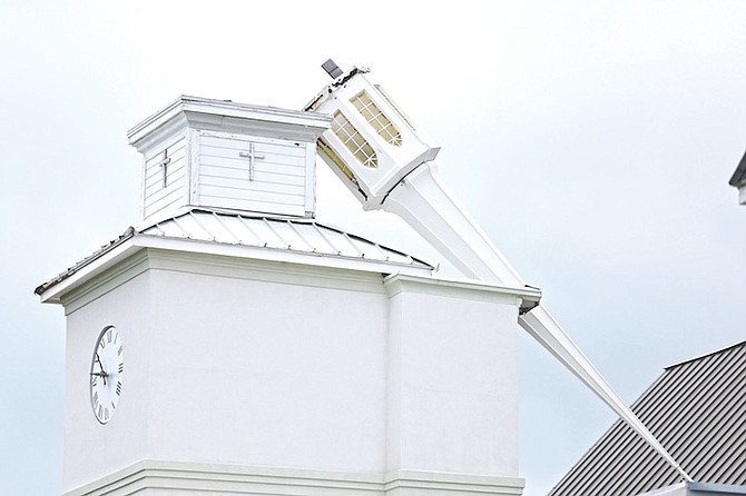THE STEEPLE of Mount Horeb Baptist Church at Sandyport collapsed on top of the church’s roof yesterday morning.