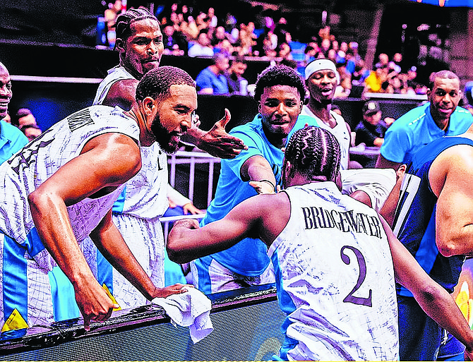 EXHIBITION WIN: Dominic Bridgewater is greeted by his team-mates after The Bahamas men’s national basketball team knocked off Nicaragua 95-56 in a blowout exhibition game last night in Managua, Nicaragua.